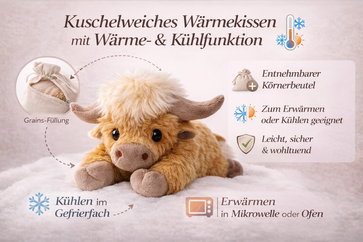 Unser kuscheliges Wärmetier vereint Geborgenheit mit Funktionalität. Dank des herausnehmbaren Beutels spendet es auf Wunsch angenehme Wärme oder wohltuende Kälte – perfekt für entspannte Momente im Alltag.